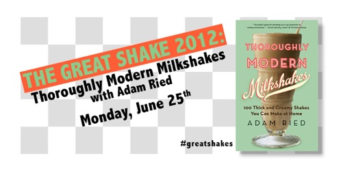 The Twitter Party: As part of the summertime fun of The Great Shake 2012, W. W. Norton and Adam Ried asked about two dozen bloggers to share their milkshake experiences. For the list of the all the bloggers writing about Thoroughly Modern Milkshakes, check out the The Great Shake webpage. Some posts are already up, and all will be available by Monday afternoon.To participate yourself and to learn more about making the best milkshakes ever, tune into the Twitter chat on Monday, June 25 at 8:00 p.m. Eastern time and follow the hashtag #GreatShakes. Adam Ried (@modernmilkshake) will be answering our questions and Judy Gelman (@DineLikeDraper) will be moderating. The only question I have right now is which flavor to make for the party!